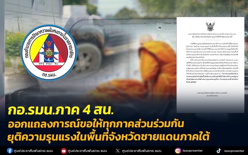 กทม. 25 เม.ย.-กอ.รมน.ภาค 4 ส่วนหน้า ออกแถลงการณ์ ขอทุกภาคส่วนร่วมกันยุติความรุนแรงในพื้นที่จังหวัดชายแดนภาคใต้ ชี้รัฐบาลพยายามทำทุกวิถีทางเพื่่อเดินหน้าสู่สันติสุข แต่ถูกวงจรความรุนแรงฉุดรั้งไว้