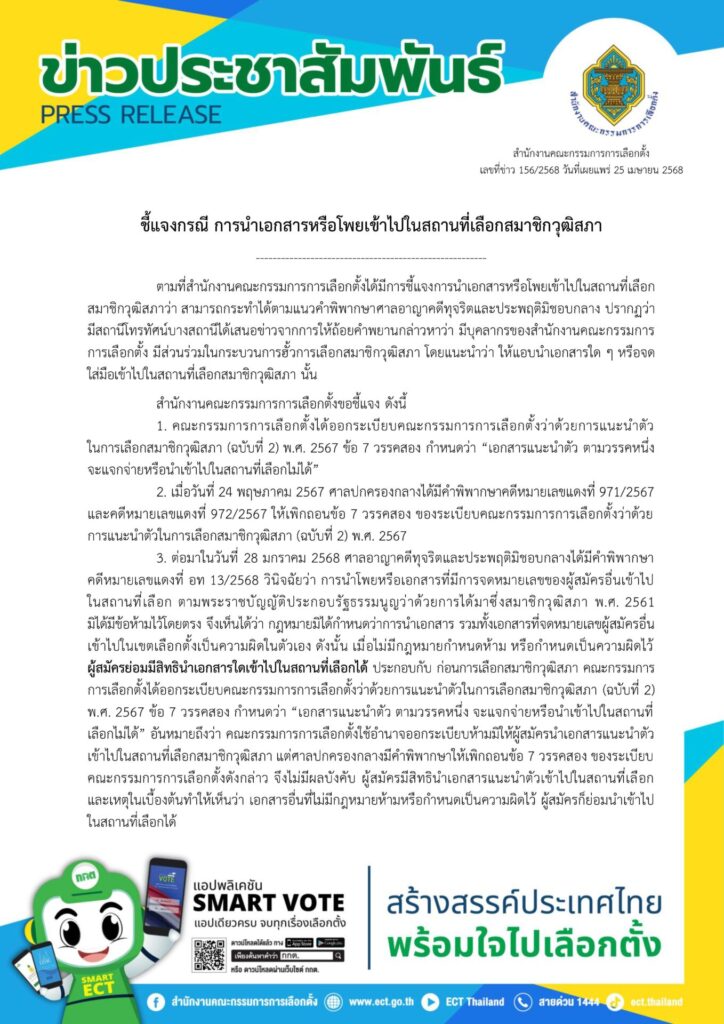 สำนัก กกต.ชี้แจงว่า คณะกรรมการการเลือกตั้งได้ออกระเบียบคณะกรรมการการเลือกตั้งว่าด้วยการแนะนำตัวในการสมัครสมาชิกวุฒิสภา (ฉบับที่ 2) พ.ศ 2567 ข้อ 7 วรรค 2 กำหนดว่า “เอกสารแนะนำตัวตามวรรค 1 จะแจกจ่ายหรือนำเข้าไปในสถานที่เลือกไม่ได้” โดยวันที่ 24 พฤษภาคม 2567 ศาลปกครองกลางได้มีคำพิพากษาคดีหมายเลขแดงที่ 971/2567 และคดีหมายเลขแดงที่ 972/2567 เพิกถอนข้อ 7 วรรค 2 ของระเบียบคณะกรรมการการเลือกตั้งว่าด้วยการแนะนำตัวดังกล่าว และต่อมาในวันที่ 28 มกราคม 2568 ศาลอาญาคดีทุจริตและประพฤติมิชอบกลางได้มีคำพิพากษา หมายเลขแดงที่ อท 13/2568 วินิจฉัยว่าการนำโพยหรือเอกสารที่มีการจดหมายเลขของผู้สมัครอื่นเข้าไปในสถานที่เลือกตามพระราชบัญญัติประกอบรัฐธรรมนูญว่าด้วยการได้มาซึ่งสมาชิกวุฒิสภา 2561 มิได้มีข้อห้ามไว้โดยตรง จึงเห็นได้ว่ากฎหมายไม่ได้กำหนดว่าการนำเอกสาร รวมทั้งเอกสารที่จดหมายเลขผู้สมัครอื่นเข้าไปในเขตเลือกตั้งเป็นความผิดในตัวเอง ดังนั้นเมื่อไม่มีกฎหมายกำหนด หรือกำหนดเป็นความผิดไว้ (กฎหมายไม่ได้ระบุว่ามีความผิดคำอธิบาย) ผู้สมัครก็ย่อมมีสิทธินำเอกสารใดเข้าไปในสถานที่เลือกได้ (เมื่อไม่มีกฎหมายห้ามก็เอาเข้าไปได้อธิบาย) ประกอบกับก่อนการเลือกสว. นั้น กกต.ได้ออกระเบียบคณะกรรมการการเลือกตั้งว่าด้วยการแนะนำตัวในการเลือกสมาชิกวุฒิสภา (ฉบับที่2) ข้อ 7 วรรค 2 กำหนดว่า “เอกสารแนะนำตัวตามวรรคหนึ่ง จะแจกจ่ายหรือนำเข้าไปในสถานที่เลือกไม่ได้” แสดงให้เห็นว่า กกต.ใช้อำนาจออกระเบียบห้ามไม่ให้ผู้สมัครนำเอกสารแนะนำตัวเข้าไปในสถานที่เลือกสมาชิกวุฒิสภา แต่ศาลปกครองกลางมีคำพิพากษาให้เพิกถอนข้อ 7 วรรค 2 ของระเบียบดังกล่าว จึงไม่มีผลบังคับ ผู้สมัครมีสิทธินำเอกสารแนะนำตัวเข้าไปในสถานที่เลือกและเหตุในเบื้องต้น ทำให้เห็นว่าเอกสารอื่นที่ไม่มีกฎหมายห้ามหรือกำหนดเป็นความผิดไว้ ผู้สมัครก็ย่อมนำเข้าไปในสถานที่เลือกได้