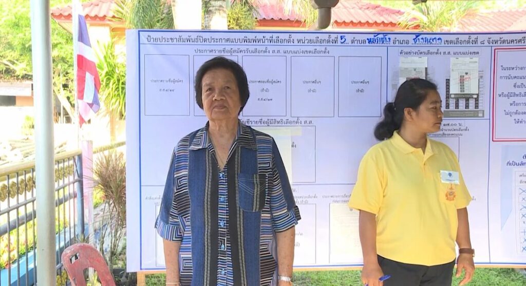 เช่นเดียวกับหน่วยเลือกตั้งที่ 5 ต.หลักช้าง อ.ช้างกลาง คุณยายเสงี่ยม อายุ 82 ปี ซึ่งเป็นอดีตกำนัน ต.หลักช้าง เป็นคนแรกที่เดินทางมาถึงหน่วยเลือกตั้ง เพื่อตรวจสอบรายชื่อ ตั้งแต่ก่อนเปิดหีบบัตร และเมื่อถึงเวลา 08.00 น. จึงได้เป็นคนแรกที่เข้าไปใช้สิทธิ ตามด้วยหลานชายที่มาด้วยกัน โดยทั้งคู่บอกว่า ตั้งใจออกมาเลือกคนดีไปเป็นปากเป็นเสียงแทนตนเองและชาวบ้านในพื้นที่ ยอมรับว่า แม้จะรู้สึกเบื่อหน่ายกับการเลือกตั้งซ่อม ที่เลือกแล้วเลือกอีก แต่ก็ต้องออกมาทำหน้าที่ในฐานะพลเมือง พร้อมกับเชิญชวนให้ผู้มีสิทธิเลือกตั้งในพื้นที่ทั้ง 4 อำเภอของ จ.นครศรีธรรมราช ออกมาใช้สิทธิใช้เสียงให้มากที่สุด