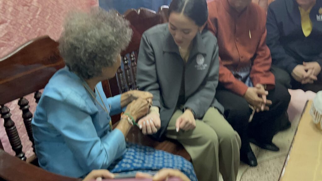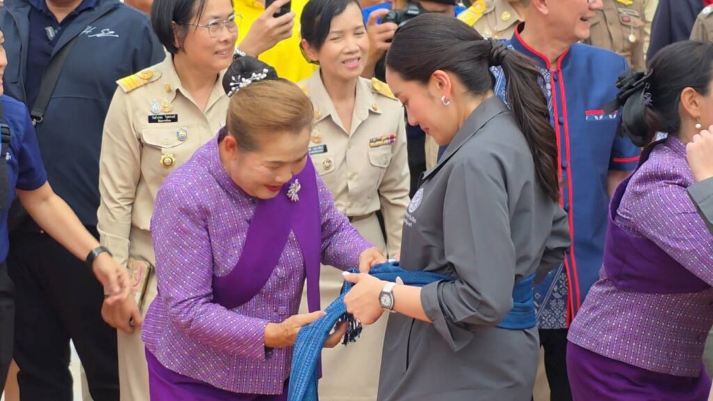 พร้อมกันนี้คุณแม่วงเดือน อุดมเดชาเวทย์ อายุ 87 ปี ผู้เคยถวายผ้าไหมลายมัดหมี ลายตาสัปรด แด่สมเด็จพระนางเจ้าสิริกิติ์ พระบรมราชินีนาถ พระพันปีหลวง เมื่อวันที่ 13 พฤศจิกายน 2515 ได้ผูกข้อมือรับขวัญนายกรัฐมนตรี โดยได้อวยพรให้นายกรัฐมนตรีเจริญ ๆ ก้าวหน้า และได้ฝากขอบคุณไปยังนายทักษิณ ชินวัตร อดีตนายกรัฐมนตรี ที่ได้ดำเนินโครงการสินค้าโอทอป และช่วยโปรโมท ทำให้เป็นที่รู้จักประชาชนในพื้นที่มีรายได้เป็นกอบเป็นกำ