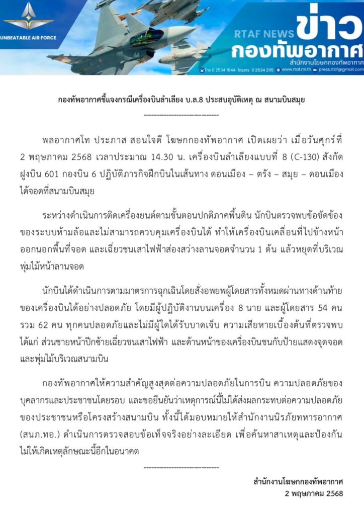 กองทัพอากาศให้ความสำคัญสูงสุดต่อความปลอดภัยในการบิน ความปลอดภัยของบุคลากรและประชาชนโดยรอบ และขอยืนยันว่าเหตุการณ์นี้ไม่ได้ส่งผลกระทบต่อความปลอดภัยของประชาชนหรือโครงสร้างสนามบิน ทั้งนี้ได้มอบหมายให้สำนักงานนิรภัยทหารอากาศ (สนภ.ทอ.) ดำเนินการตรวจสอบข้อเท็จจริงอย่างละเอียด เพื่อค้นหาสาเหตุและป้องกันไม่ให้เกิดเหตุลักษณะนี้อีกในอนาคต.-313 สำนักข่าวไทย