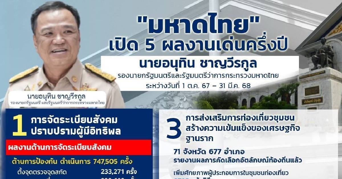 ก.มหาดไทย 7 พ.ค.-“มหาดไทย” โชว์ 5 ผลงานเด่น “ยุค มท. หนู” จัดระเบียบสังคม-ปราบผู้มีอิทธิพล แก้ปัญหายาเสพติด สร้างอาชีพ ท่องเที่ยวชุมชนเสริมแกร่งเศรษฐกิจฐานราก น้ำดื่มสะอาดฟรี