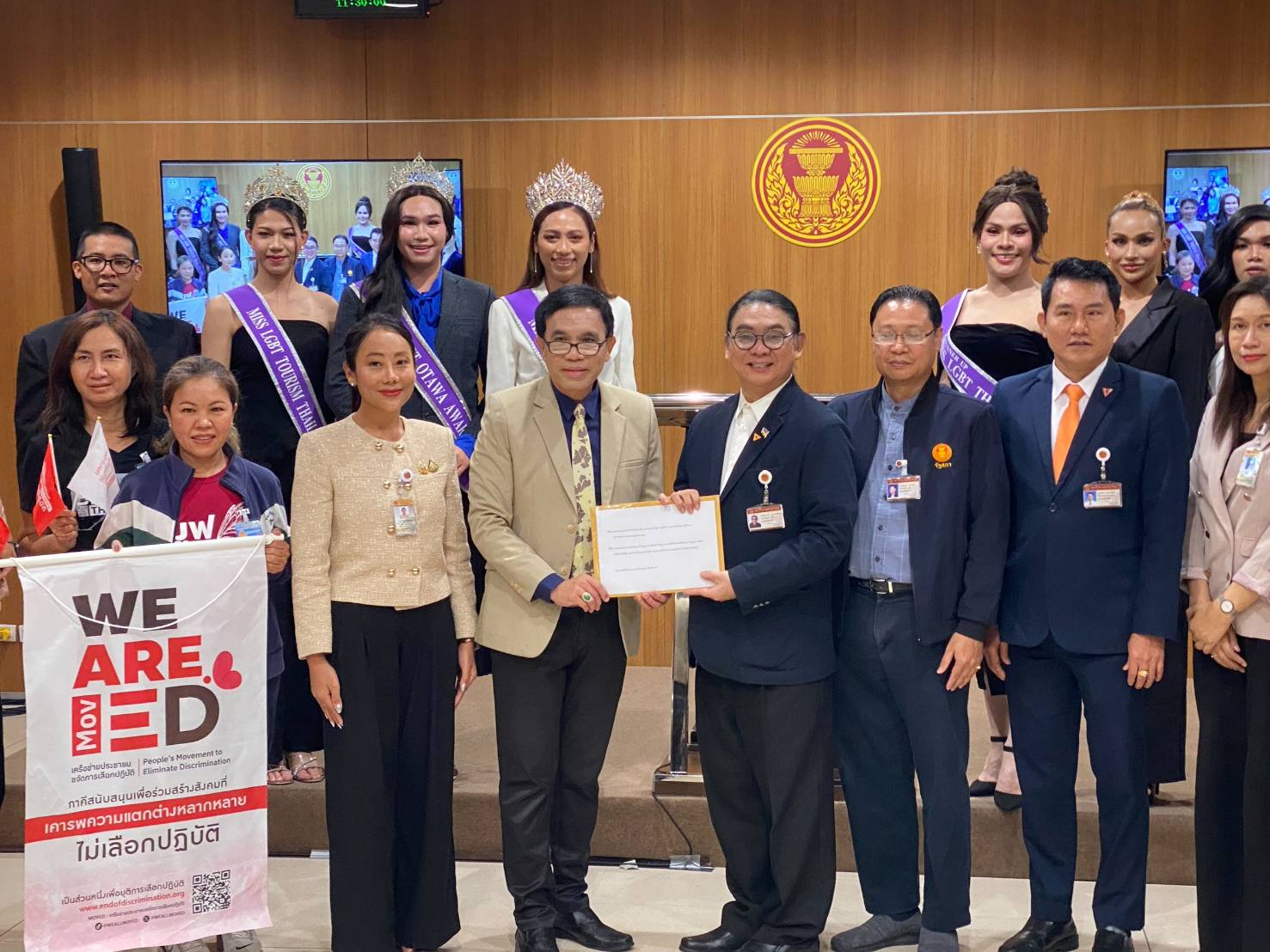 รัฐสภา 8 พ.ค.- กมธ.เด็ก เยาวชน สตรี ผู้สูงอายุ ผู้พิการ กลุ่มชาติพันธุ์ และผู้มีความหลากหลายทางเพศ รับหนังสือจากสมาคมฟ้าสีรุ้งแห่งประเทศไทย และภาคประชาชน 54 องค์กร เรียกร้องให้รัฐเร่งออกกฎหมายรับมือ “อาชญากรรมแห่งความเกลียดชัง”