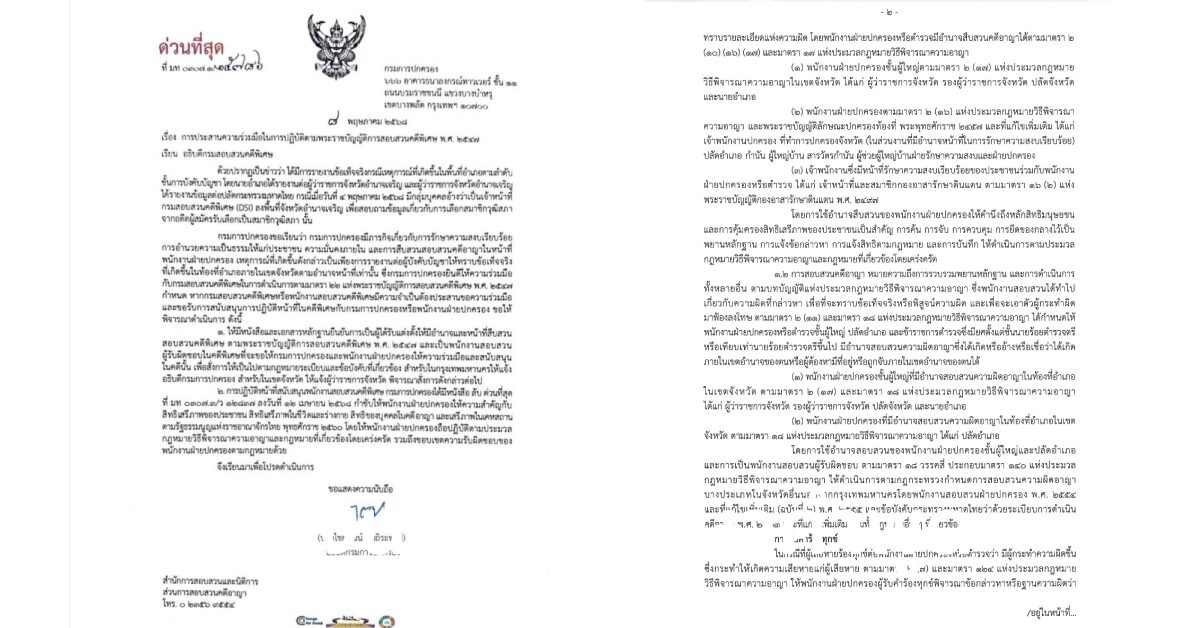 - การปฏิบัติหน้าที่สนับสนุนพนักงานสอบสวนคดีพิเศษ กรมการปกครองได้มีหนังสือ ลับ ด่วนที่สุดที่ มท 0307.3/ว 12837 ลงวันที่ 12เมษายน 2568 กำซับให้พนักงานฝ่ายปกครองให้ความสำคัญกับสิทธิเสรีภาพของประชาชน สิทธิเสรีภาพในชีวิตและร่างกาย สิทธิของบุคคลในคดีอาญา และเสรีภาพในเคหสถานตามรัฐธรรมนูญแห่งราชอาณาจักรไทย โดยให้พนักงานฝ่ายปกครองถือปฏิบัติตามประมวลกฎหมายวิธีพิจารณาความอาญาและกฎหมายที่เกี่ยวข้องโดยเคร่งครัด รวมถึงขอบเขตความรับผิดชอบของ