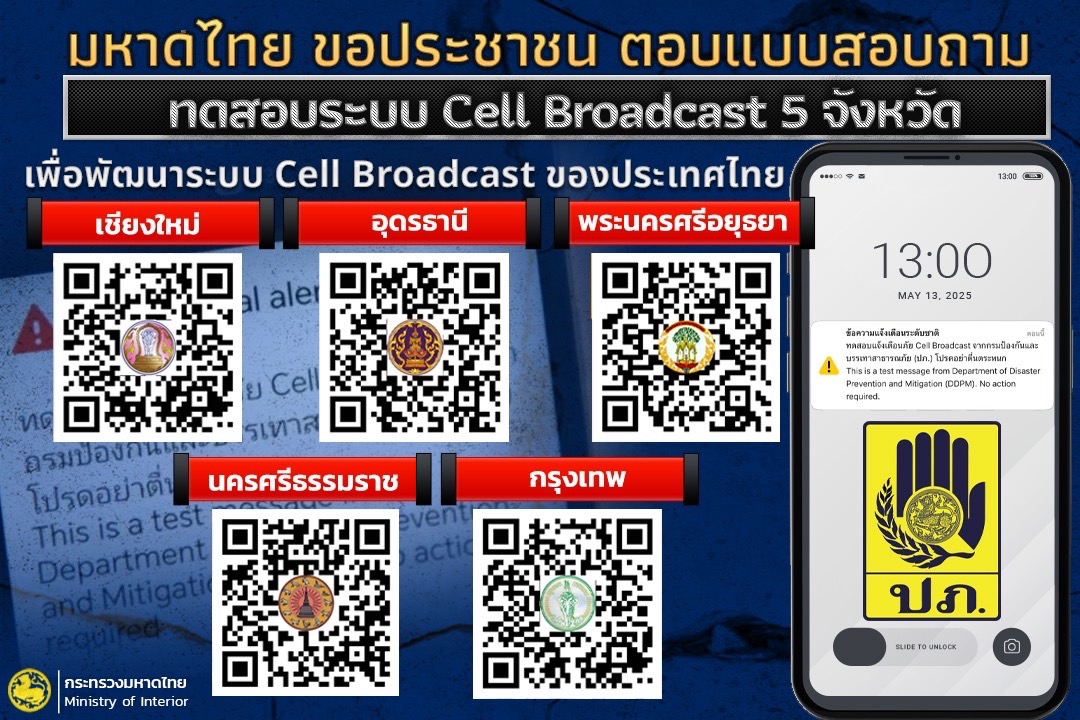 กรุงเทพฯ 13 พ.ค. – “มหาดไทย” ขอเชิญประชาชนตอบแบบสอบถาม ทดสอบระบบเตือนภัย Cell Broadcast 5 จังหวัด คาดใช้ระบบสมบูรณ์ได้จริง ก.ค.นี้