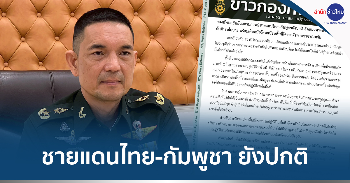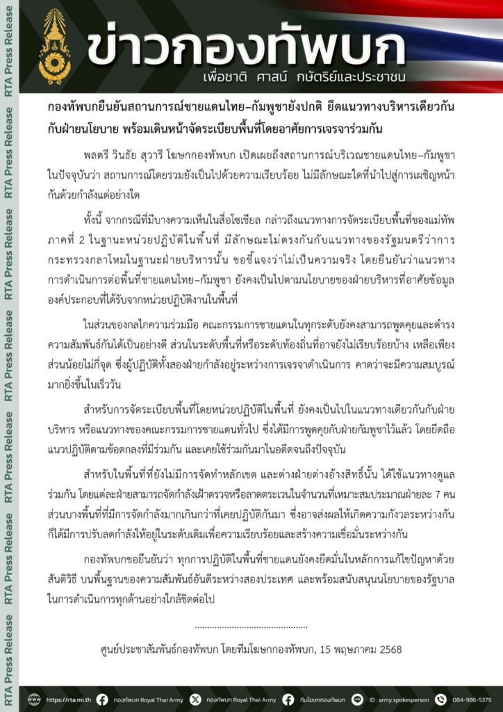 กองทัพบก 15 พ.ค.- ทบ. แจงสถานการณ์ชายแดนไทย-กัมพูชา ยังปกติ ยึดแนวทางบริหารเดียวกันกับฝ่ายนโยบาย พร้อมเดินหน้าจัดระเบียบพื้นที่โดยอาศัยการเจรจาร่วมกัน ยันทัพภาค 2 ไม่ได้ขัดแย้ง “ภูมิธรรม”
