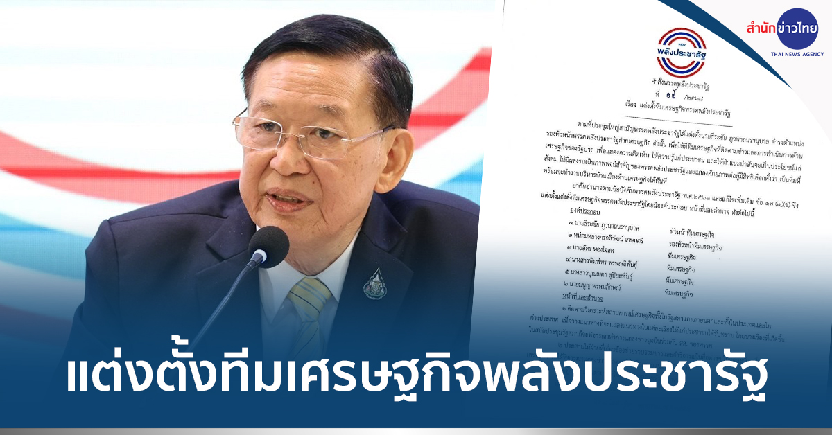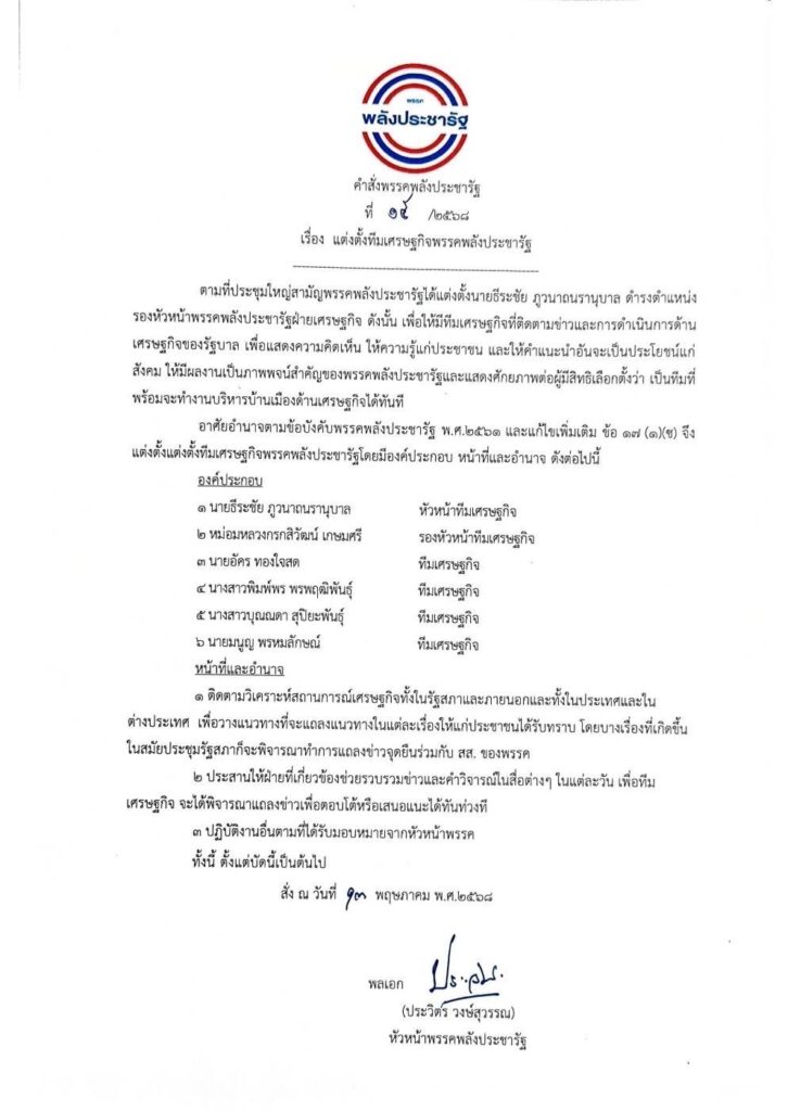 นายไพบูลย์ นิติตะวัน เลขาธิการพรรคพลังประชารัฐ(พปชร.)กล่าวว่า ภายหลังจากที่พล.อ.ประวิตร วงษ์สุวรรณ หัวหน้าพรรคพลังประชารัฐ ได้ลงนามในคำสั่งพรรคพลังประชารัฐที่ 15/ 2568 แต่งตั้งทีมเศรษฐกิจพรรคพลังประชารัฐ อย่างเป็นทางการ อาศัยอำนาจตามข้อบังคับพรรคพลังประชารัฐ พ.ศ.2561 และแก้ไขเพิ่มเติม ข้อ 17 (1) ทั้งนี้ทีมเศรษฐกิจพรรคพลังประชารัฐโดย ประกอบด้วย