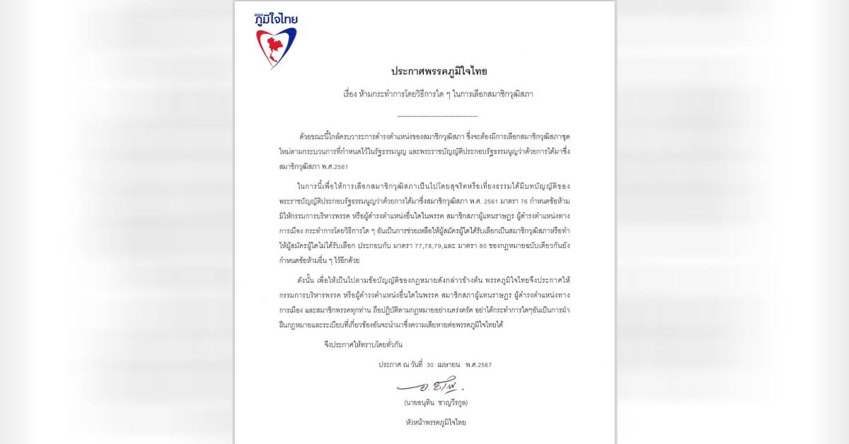 กทม. 20 พ.ค.-เปิดหนังสือภูมิใจไทย “อนุทิน” สั่งลูกพรรคห้ามยุ่งการเลือก สว. โดยประกาศไว้วันที่ 30 เม.ย.67 ก่อนเลือก สว. 2 เดือน