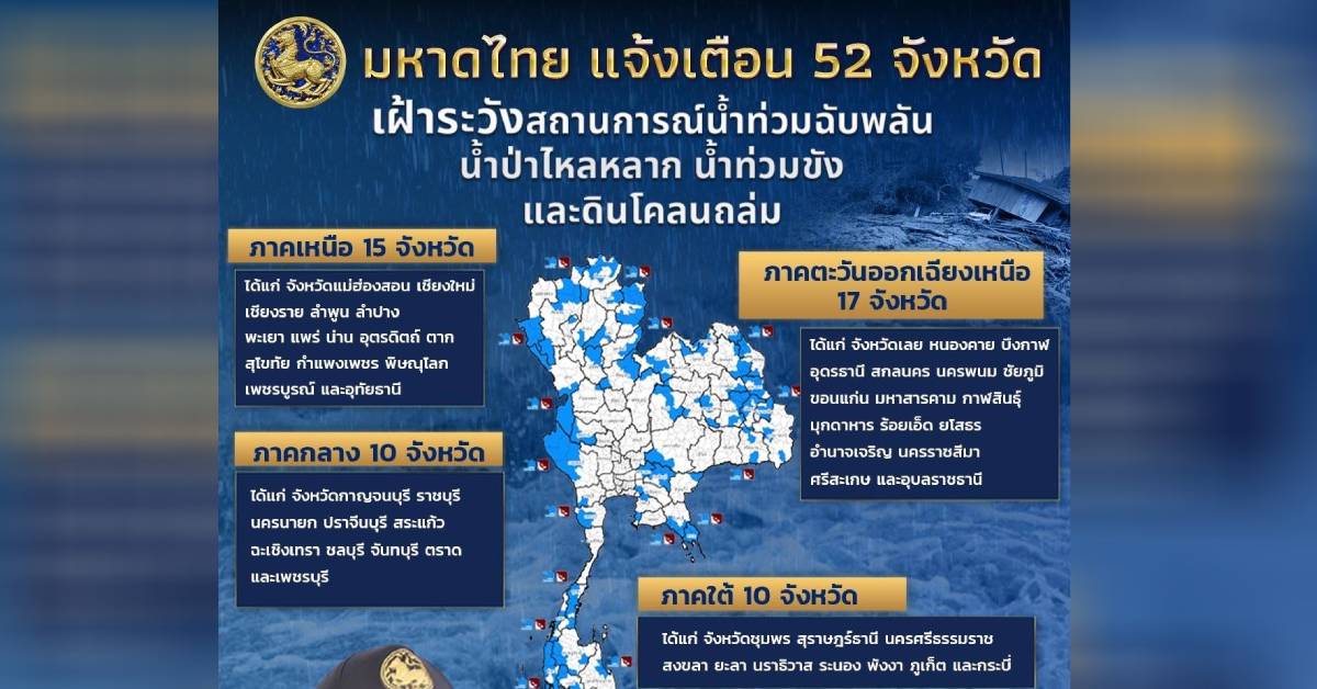 กทม 23 ก.พ.-ปภ. มหาดไทย แจ้ง 52 จังหวัด เฝ้าระวังน้ำท่วมฉับพลัน น้ำป่าไหลหลาก ดินโคลนถล่ม และน้ำท่วมขัง ช่วง 23-27 พ.ค.68 เร่งประสานพื้นที่เสี่ยงภัยเฝ้าระวัง และเตรียมพร้อมรับมือ