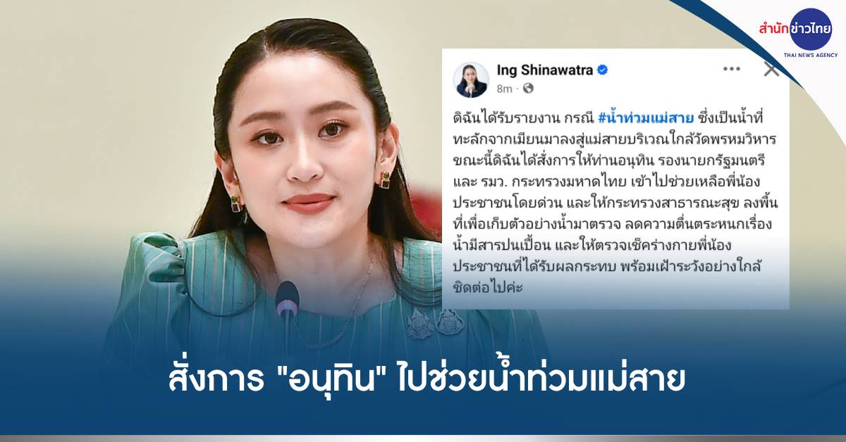 นางสาวแพทองธาร ชินวัตร นายกรัฐมนตรี โพสต์โซเชียล ระบุว่า ได้รับรายงาน กรณี น้ำท่วมแม่สาย ซึ่งเป็นน้ำที่ทะลักจากเมียนมาลงสู่แม่สายบริเวณใกล้วัดพรหมวิหาร จึงได้สั่งการให้นายอนุทิน ชาญวีรกูล รองนายกรัฐมนตรี และรัฐมนตรีว่าการกระทรวงมหาดไทย เข้าไปช่วยเหลือพี่น้องประชาชนโดยด่วน และให้กระทรวงสาธารณสุข ลงพื้นที่เพื่อเก็บตัวอย่างน้ำมาตรวจ ลดความตื่นตระหนกเรื่องน้ำมีสารปนเปื้อน และให้ตรวจเช็คร่างกายพี่น้องประชาชนที่ได้รับผลกระทบ พร้อมเฝ้าระวังอย่างใกล้ชิดต่อไป.-319.-สำนักข่าวไทย