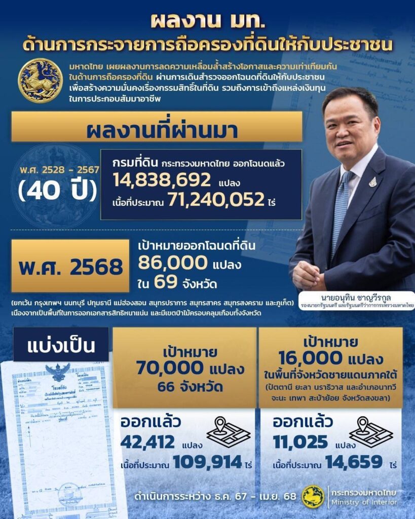 กทม.25 พ.ค. – “มหาดไทย” เดินหน้าสำรวจที่ดินลดเหลื่อมล้ำ เล็งเป้าปีนี้ออกโฉนด 86,000 แปลง ใน 69 จังหวัด พร้อมเปิดสถิติ 40 ปีออกโฉนดแล้วกว่า 14 ล้านแปลง 71 ล้านไร่