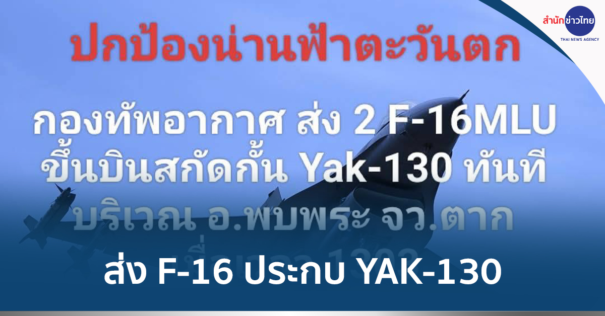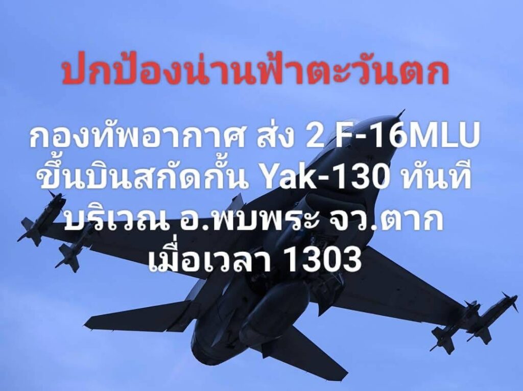 ผู้สื่อข่าวรายงานว่า หลังจากตรวจพบเครื่องบินของทหารเมียนมา บินเข้าใกล้พรมแดนไทย กองทัพอากาศ ได้ส่ง F-16MLU จำนวน 2 ลำขึ้นบินสกัดกั้น Yak-130 ทันที บริเวณ อ.พบพระ จ.ตาก ไปในเวลา 13.05 น.-313 -สำนักข่าวไทย