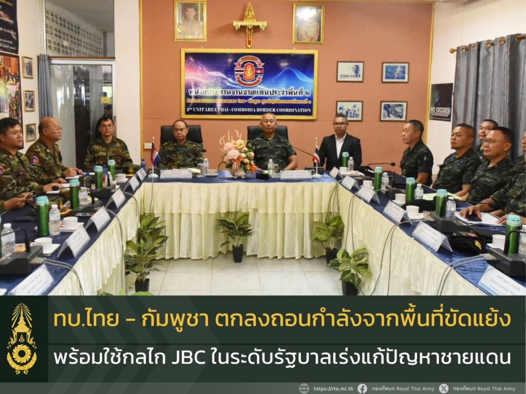 กองทัพบก 29 พ.ค.- เผยผลการเจรจา ผบ.ทบ.ไทย-กัมพูชา สามารถบรรลุข้อตกลงในการถอนกำลังออกจากพื้นที่ขัดแย้ง พร้อมใช้กลไก JBC ในระดับรัฐบาลเร่งแก้ปัญหาในพื้นที่ชายแดน