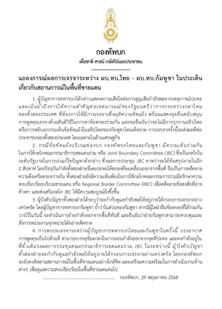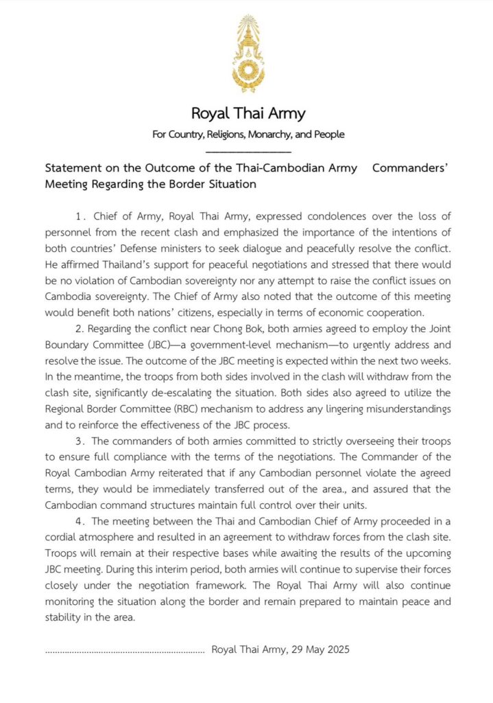4.การพบปะเจรจาระหว่างผู้บัญชาการทหารบกไทยและกัมพูชาในครั้งนี้ บรรยากาศการพูดคุยเป็นไปด้วยดี สามารถบรรลุข้อตกลงในการถอนกำลังออกจากจุดที่ปะทะ และคงกำลังอยู่ในที่ตั้งเดิมรอผลการประชุมคณะกรรมาธิการเขตแดนร่วม JBC ในระหว่างนี้ ผู้บังคับบัญชาทั้งสองฝ่ายจะกำกับดูแลกำลังพลให้อยู่ภายใต้กรอบการเจรจาอย่างเคร่งครัด