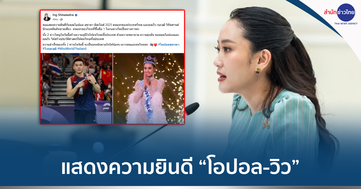 นางสาวแพทองธาร ชินวัตร นายกรัฐมนตรี โพสต์แสดงความยินดีกับคุณโอปอล สุชาตา มิสเวิลด์ 2025 คนแรกของประเทศไทย และคุณวิว-กุลวุฒิ วิทิตศานต์ นักแบดมินตันชายเดี่ยวคนแรกของไทยที่ขึ้นมือ 1 โลกอย่างไม่เป็นทางการค่ะ