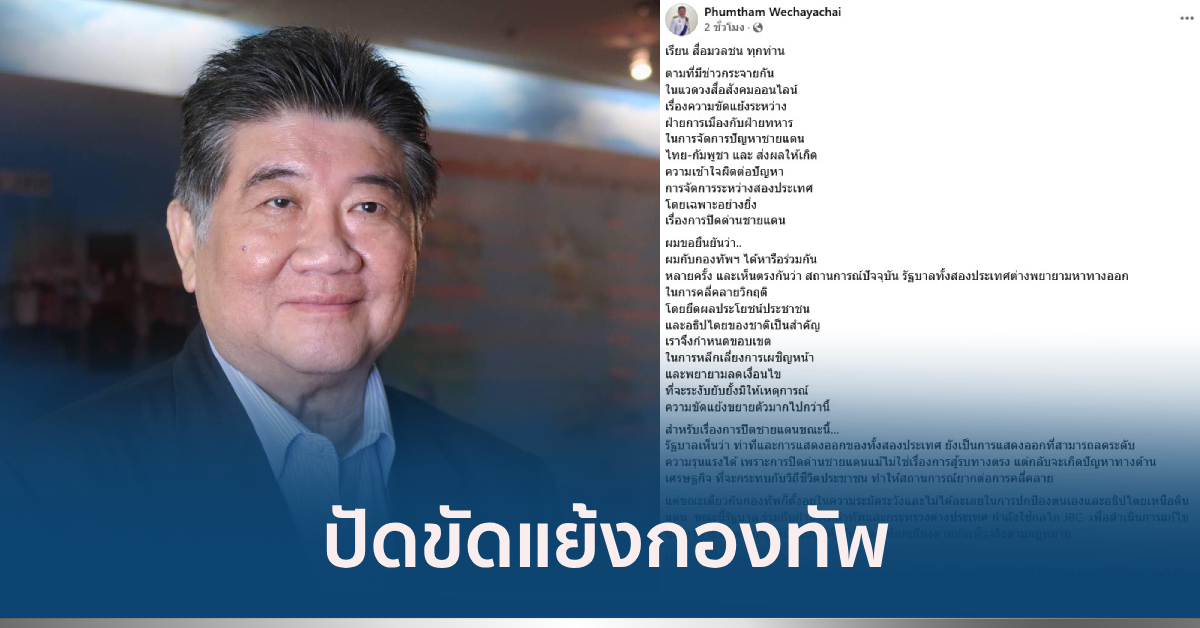 เรียน สื่อมวลชน ทุกท่าน ตามที่มีข่าวกระจายกันในแวดวงสื่อสังคมออนไลน์ เรื่องความขัดแย้งระหว่างฝ่ายการเมืองกับฝ่ายทหาร ในการจัดการปัญหาชายแดนไทย-กัมพูชา และส่งผลให้เกิดความเข้าใจผิดต่อปัญหาการจัดการระหว่างสองประเทศ โดยเฉพาะอย่างยิ่งเรื่องการปิดด่านชายแดน