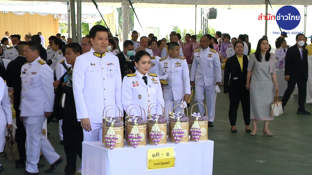 ต่อจากนั้น นายกรัฐมนตรี พร้อมด้วยประธานองคมนตรี ประธานรัฐสภา ประธานศาลฎีกาและคู่สมรส ประธานวุฒิสภา และประธานองค์กรอิสระ ถวายผ้าไตรและเครื่องไทยธรรม พระสงฆ์อนุโมทนา ถวายอดิเรก นายกรัฐมนตรีกรวดน้ำ และกราบนมัสการพระรัตนตรัยหน้าโต๊ะหมู่บูชา และถวายความเคารพหน้าพระฉายาลักษณ์สมเด็จพระนางเจ้าฯ พระบรมราชินี ก่อนจะนำผู้เข้าร่วมในพิธีตักบาตร โดยมี สมเด็จพระราชาคณะ พระราชาคณะ และพระสงฆ์ จำนวน 148 รูป เดินรับบิณฑบาต