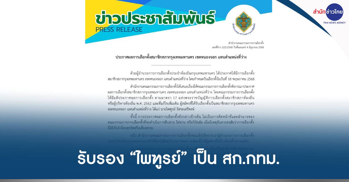 กกต. 4 มิ.ย.-กกต. ประกาศรับรอง “ไพฑูรย์ อิสระเสรีพงษ์” เป็น สก.กทม. เขตหนองจอก แทนตำแหน่งที่ว่าง