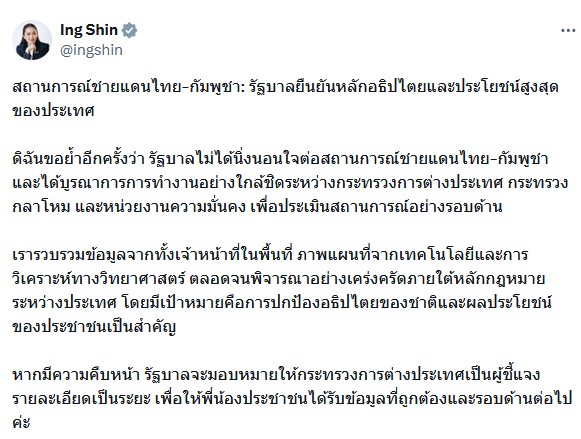 “ดิฉันขอย้ำอีกครั้งว่า รัฐบาลไม่ได้นิ่งนอนใจต่อสถานการณ์ชายแดนไทย-กัมพูชา และได้บูรณาการการทำงานอย่างใกล้ชิดระหว่างกระทรวงการต่างประเทศ กระทรวงกลาโหม และหน่วยงานความมั่นคง เพื่อประเมินสถานการณ์อย่างรอบด้าน”