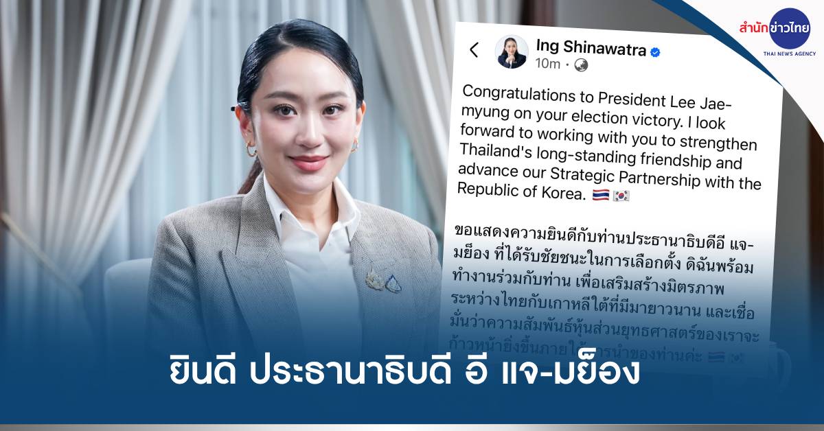 ขอแสดงความยินดีกับท่านประธานาธิบดีอี แจ-มย็อง ที่ได้รับชัยชนะในการเลือกตั้ง ดิฉันพร้อมทำงานร่วมกับท่าน เพื่อเสริมสร้างมิตรภาพระหว่างไทยกับเกาหลีใต้ที่มีมายาวนาน และเชื่อมั่นว่าความสัมพันธ์หุ้นส่วนยุทธศาสตร์ของเราจะก้าวหน้ายิ่งขึ้นภายใต้การนำของท่านค่ะ 🇹🇭🇰🇷” .-315.-สำนักข่าวไทย