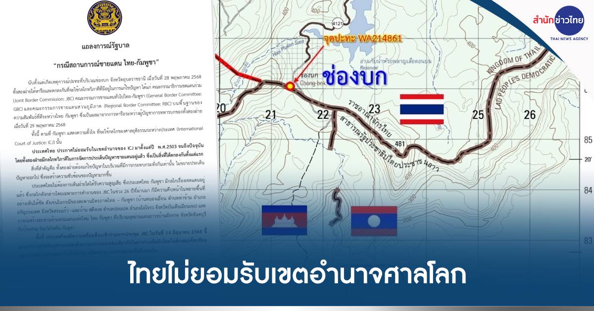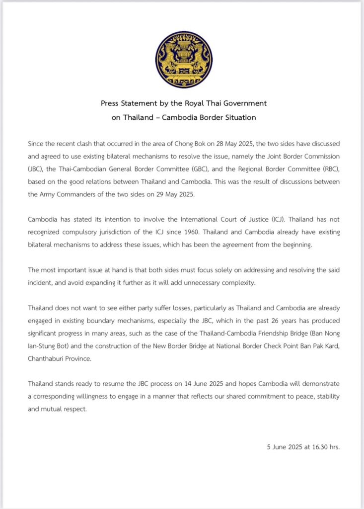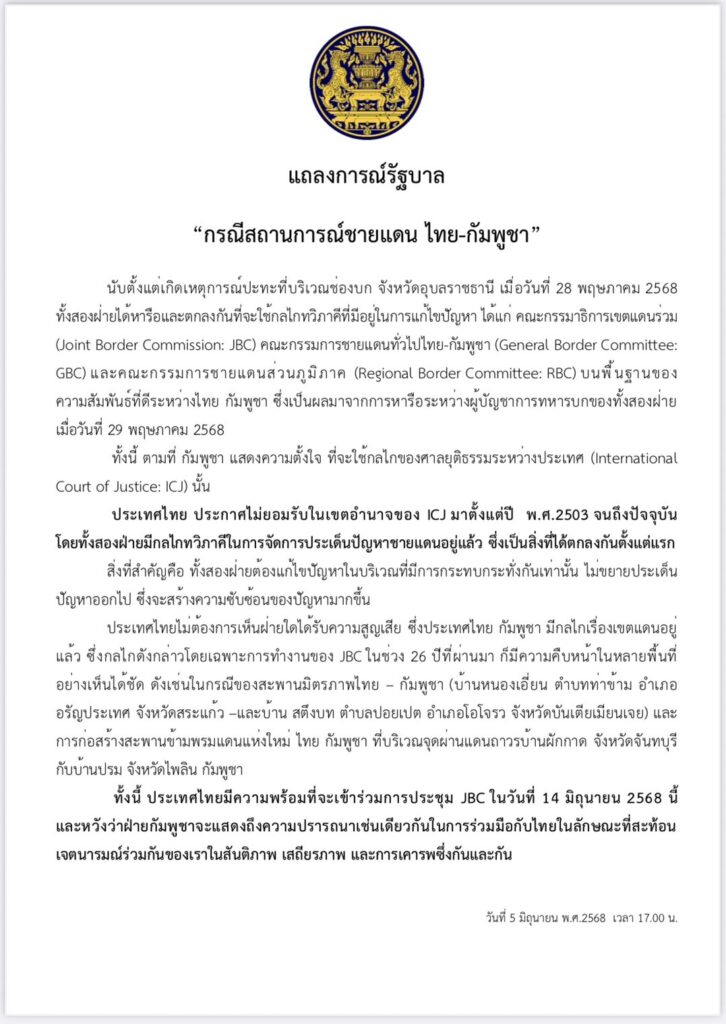 ทำเนียบ 5 มิ.ย.-รัฐบาลออกแถลงการณ์กรณีไทย-กัมพูชา ยืนยันประเทศไทยไม่ยอมรับเขตอำนาจศาลโลกมาตั้งแต่ พ.ศ. 2503 จนถึงปัจจุบันแล้ว ย้ำขอใช้กรอบ JBC ในทุกระดับแก้ปัญหาระหว่างกัน