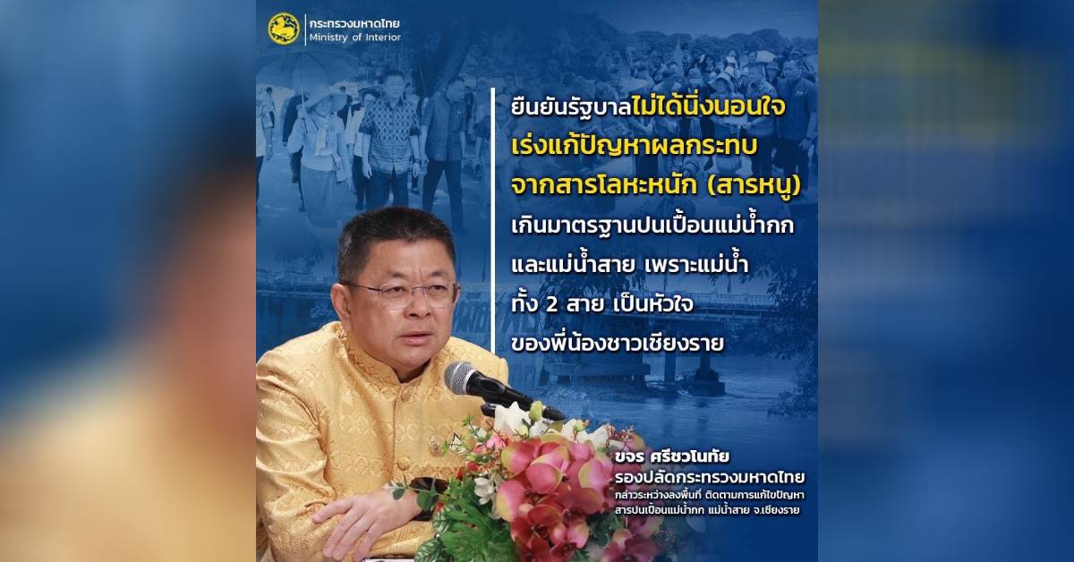 กทม. 5 มิ.ย.-“มหาดไทย” รับเรื่องร้องเรียนชาวบ้านได้รับผลกระทบจากสารปนเปื้อนแม่น้ำกก-แม่น้ำสาย ยืนยันไม่นิ่งนอนใจ เพราะเป็นแม่น้ำหลักเปรียบเหมือนหัวใจ