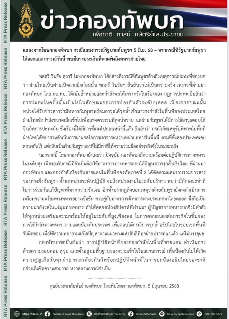 พล.ต.วินธัย สุวารี โฆษกกองทัพบก ได้กล่าวถึงกรณีที่ทางรัฐบาลกัมพูชา ได้ออกแถลงการณ์วันนี้ พบมีบางประเด็นที่พาดพิงถึงทหารฝ่ายไทย โดยอ้างถึงเหตุการณ์ปะทะที่ช่องบกว่า ฝ่ายไทยเป็นฝ่ายเปิดฉากยิงก่อนนั้น ยืนยันว่าไม่เป็นความจริง เพราะที่ผ่านมา กองทัพบกโดย ผู้บัญชาการทหารบก (ผบ.ทบ.) ได้เน้นย้ำหน่วยและกำลังพลให้เคร่งครัดในเรื่องของ กฎการปะทะ ยืนยันว่าการปะทะในครั้งนั้นเป็นไปในลักษณะของการป้องกันตัวระดับบุคคล
