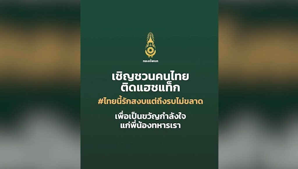 ล่าสุด กองทัพบกได้โพสต์ข้อความ “… การสนับสนุนทหาร ไม่ใช่การสนับสนุนสงคราม ทหารเตรียมความพร้อมเพื่อปกป้องอธิปไตยของประเทศไทย….” และมีการโพสต์คลิป กองทัพบกตรวจความพร้อม ทิ้งท้ายด้วย #ไทยนี้รักสงบแต่ถึงรบไม่ขลาด