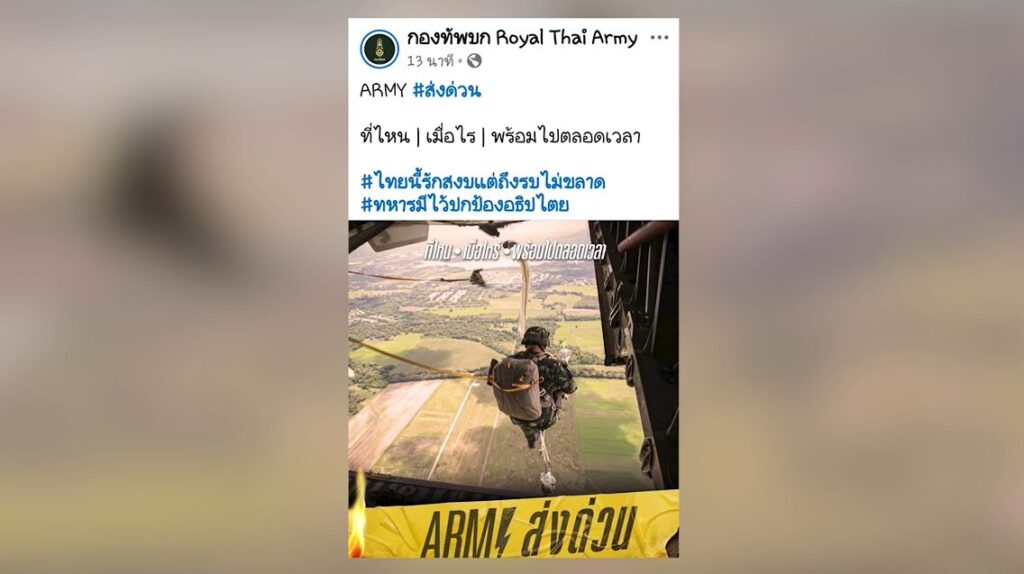 เช่นเดียวกับ เพจกองทัพบก โพสต์ภาพทหารโดดร่ม พร้อมข้อความ Army ส่งด่วน และ #ไทยนี้รักสงบแต่ถึงรบไม่ขลาด