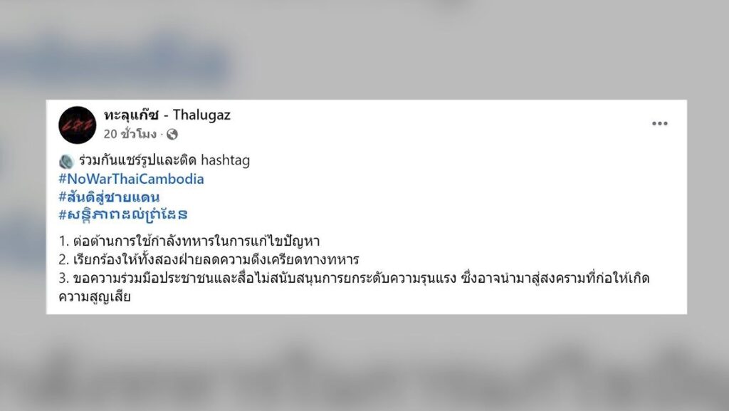 ในขณะที่โซเชียลให้กำลังใจสนันสนุนทหารในการปกป้องอธิปไตยของประเทศ แต่ก็มีบางเพจที่ออกมาต่อต้านสงคราม อย่างกลุ่ม ‘ทะลุแก๊ซ’ ได้โพสต์ข้อความเชิญชวนผู้ใช้โซเชียลมีเดีย ติดแฮชแท็ก #NoWarThaiCambodia #สันติสู่ชายแดน พร้อมประกาศข้อเรียกร้อง 3 ข้อ