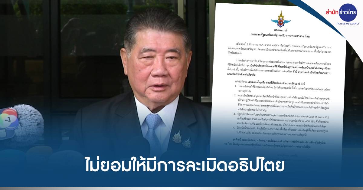 1.ไทยจะไม่ยอมให้มีการละเมิดอธิปไตย ไม่ว่าด้วยเหตุผลใดทั้งสิ้น และพร้อมปกป้องอธิปไตยของไทยอย่างสุดกำลัง