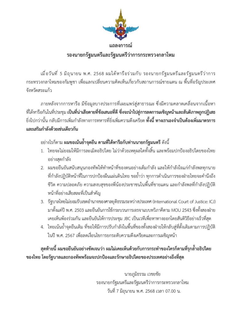 นายภูมิธรรม เวชยชัย รองนายกฯ และ รมว.กลาโหม ออกแถลงการณ์ ระบุเมื่อวันที่ 5 มิถุนายน พ.ศ. 2568 ผมได้หารือร่วมกับ รองนายกรัฐมนตรีและรัฐมนตรีว่าการกระทรวงกลาโหมของกัมพูชา เพื่อแลกเปลี่ยนความคิดเห็นเกี่ยวกับสถานการณ์ชายแดน ณ พื้นที่อรัญประเทศ จังหวัดสระแก้ว