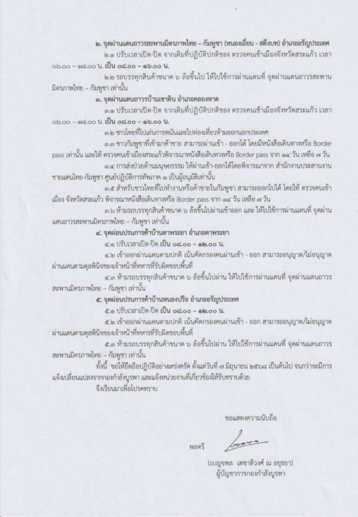 3.3 ชาวกัมพูชาที่เข้ามาค้าขาย สามารถผ่านเข้า-ออก ได้ โดยมีหนังสือเดินทางหรือ Border pass เท่านั้น และให้ตรวจคนเข้าเมืองสระแก้วพิจารณาหนังสือเดินทาง หรือ Border pass จาก 14 วัน เหลือ 7 วัน