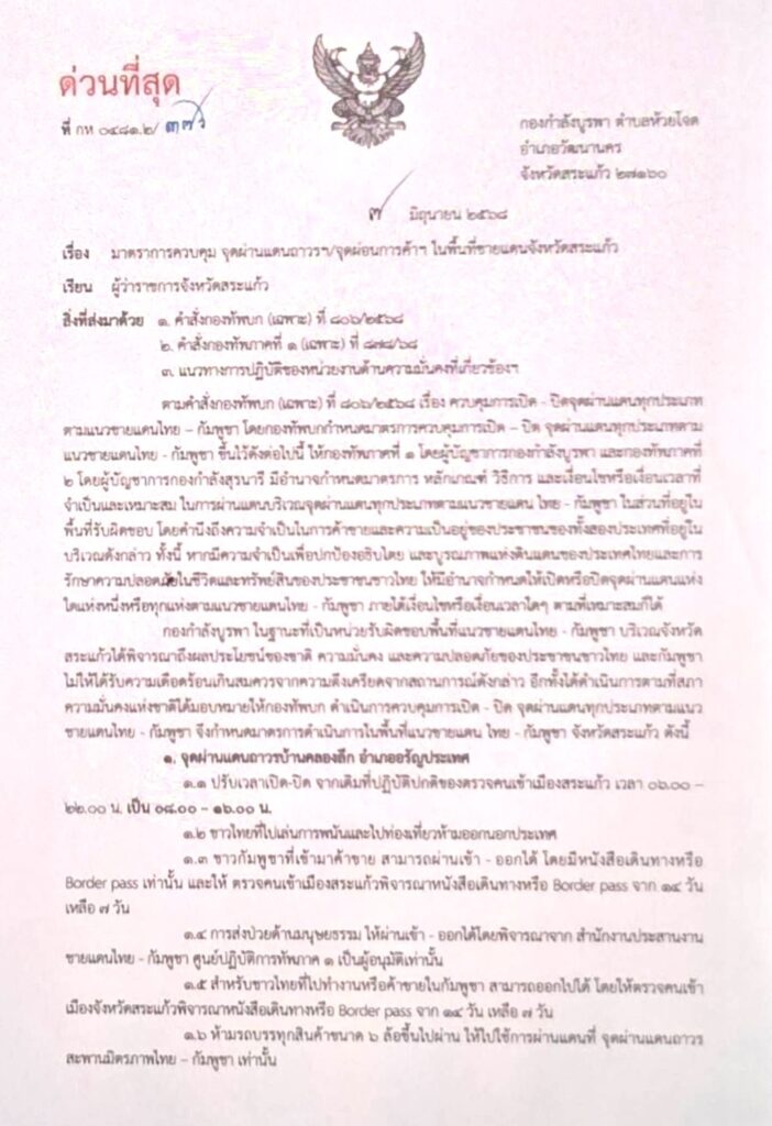 เมื่อเวลา 19.10 น. พล.ต.เบญจพล เดชาติวงศ์ ณ อยุธยา ผู้บัญชาการกองกำลังบูรพา (ผบ.กกล.บูรพา) ได้ทำหนังสือด่วนที่สุดถึงผู้ว่าราชการจังหวัดสระแก้ว เรื่องมาตรการควบคุมจุดผ่านแดนถาวร จุดผ่อนการค้าในพื้นที่ชายแดนจังหวัดสระแก้ว พร้อมแนบคำสั่งกองทัพบก (เฉพาะ) ที่ 806 / 2568, คำสั่งกองทัพภาคที่ 1 (เฉพาะ) ที่ 878/68 และแนวทางการปฏิบัติของหน่วยงานด้านความมั่นคงที่เกี่ยวข้อง