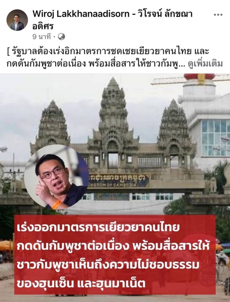 นายวิโรจน์ ลักขณาอดิศร สส.บัญชีรายชื่อ พรรคประชาชน โพสต์เฟสบุ๊กระบุว่า รัฐบาลต้องเร่งออกมาตรการชดเชยเยียวยาคนไทย และกดดันกัมพูชาต่อเนื่อง พร้อมสื่อสารให้ชาวกัมพูชาเห็นถึงความไม่ชอบธรรมของฮุน เซน และฮุน มาเนต จากท่าทีของฮุน เซน ที่ระบุว่าประเทศไทยต้องรับผิดชอบต่อมาตรการปิดด่านที่เกิดขึ้น พร้อมมีท่าทีที่พยายามที่จะทำให้กระแสชาตินิยมที่ตนเองปลุกขึ้นมาให้สงบลง สะท้อนว่า “มาตรการการปิดด่าน” ของเราได้ผล และสร้างผลกระทบต่อกลุ่มทุนที่สนับสนุนตระกูลฮุน ได้อย่างมีนัยสำคัญ