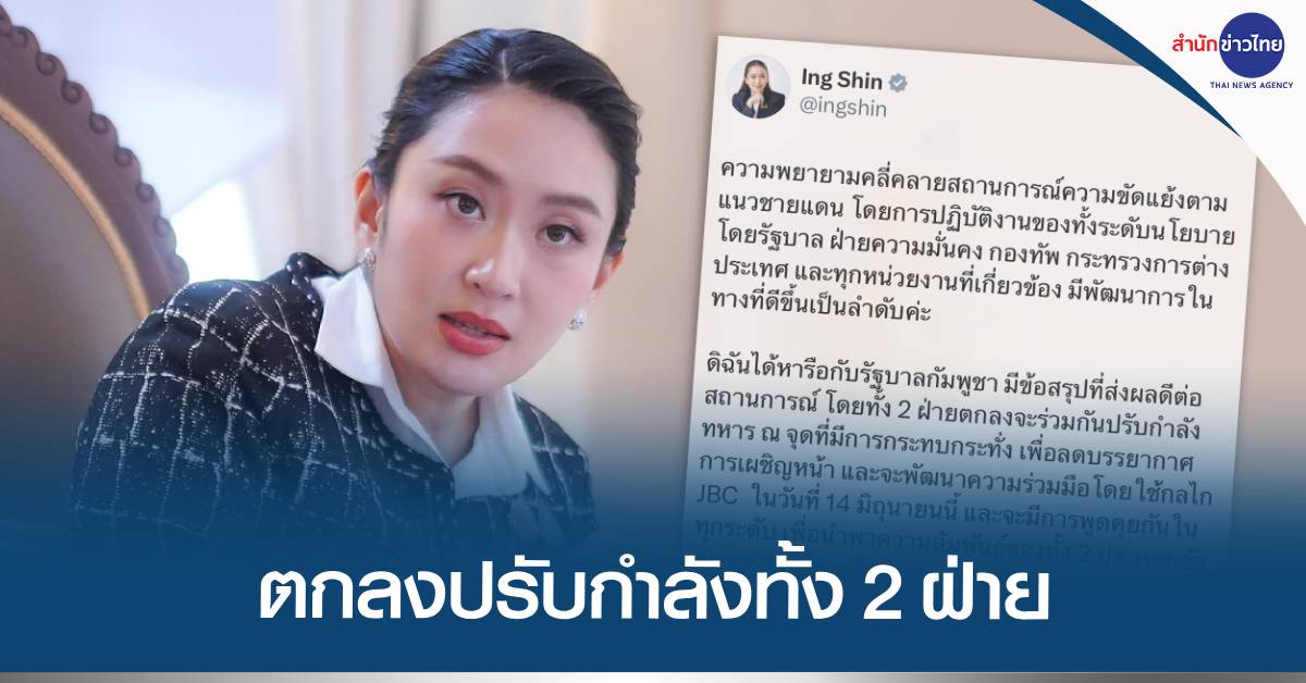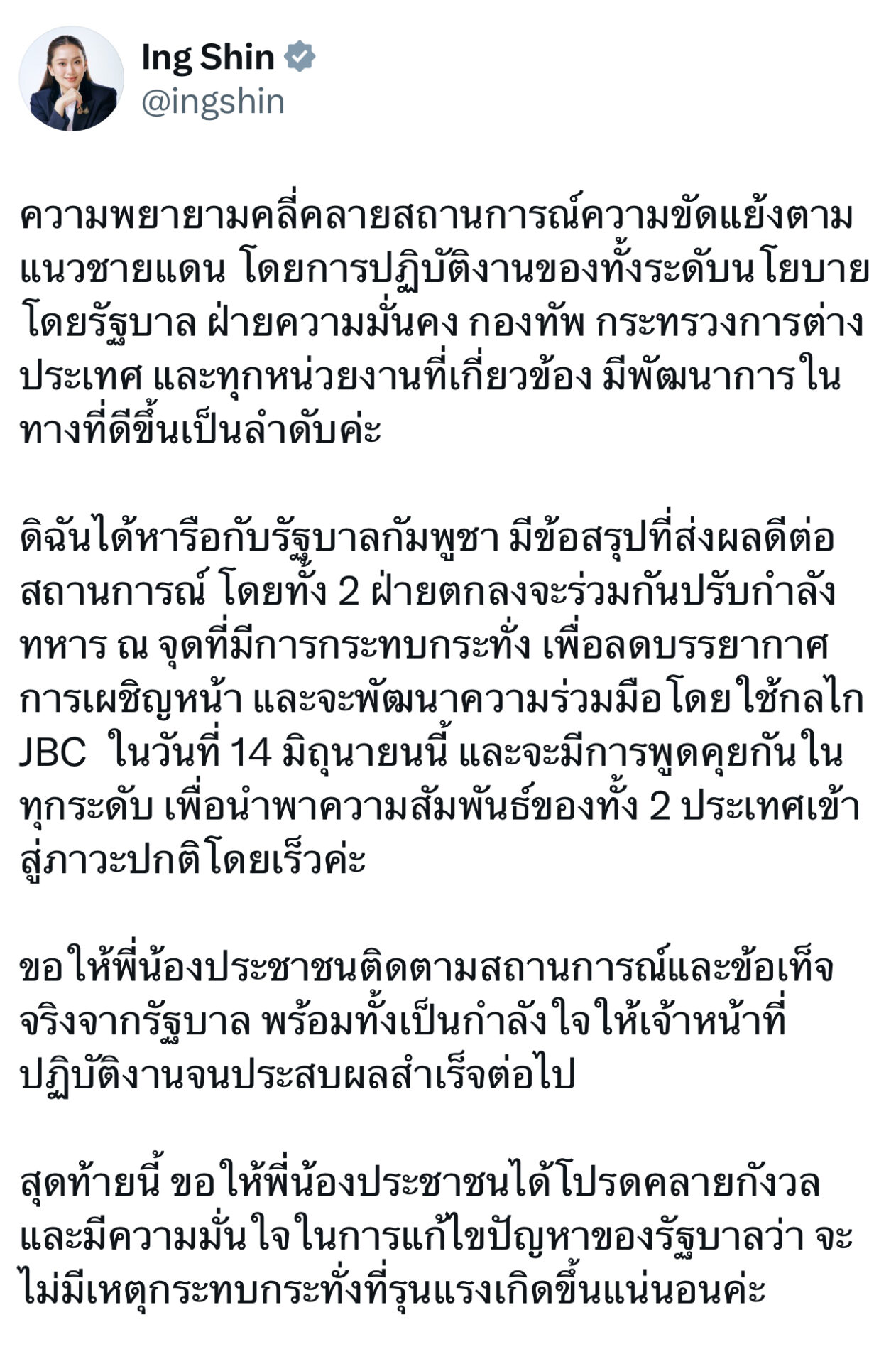 ดิฉันได้หารือกับรัฐบาลกัมพูชา มีข้อสรุปที่ส่งผลดีต่อสถานการณ์ โดยทั้ง 2 ฝ่ายตกลงจะร่วมกันปรับกำลังทหาร ณ จุดที่มีการกระทบกระทั่ง เพื่อลดบรรยากาศการเผชิญหน้า และจะพัฒนาความร่วมมือโดยใช้กลไก JBC ในวันที่ 14 มิถุนายนนี้ และจะมีการพูดคุยกันในทุกระดับ เพื่อนำพาความสัมพันธ์ของทั้ง 2 ประเทศเข้าสู่ภาวะปกติโดยเร็วค่ะ