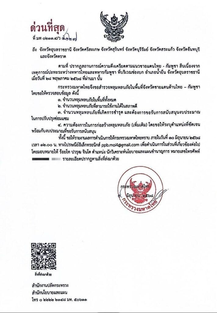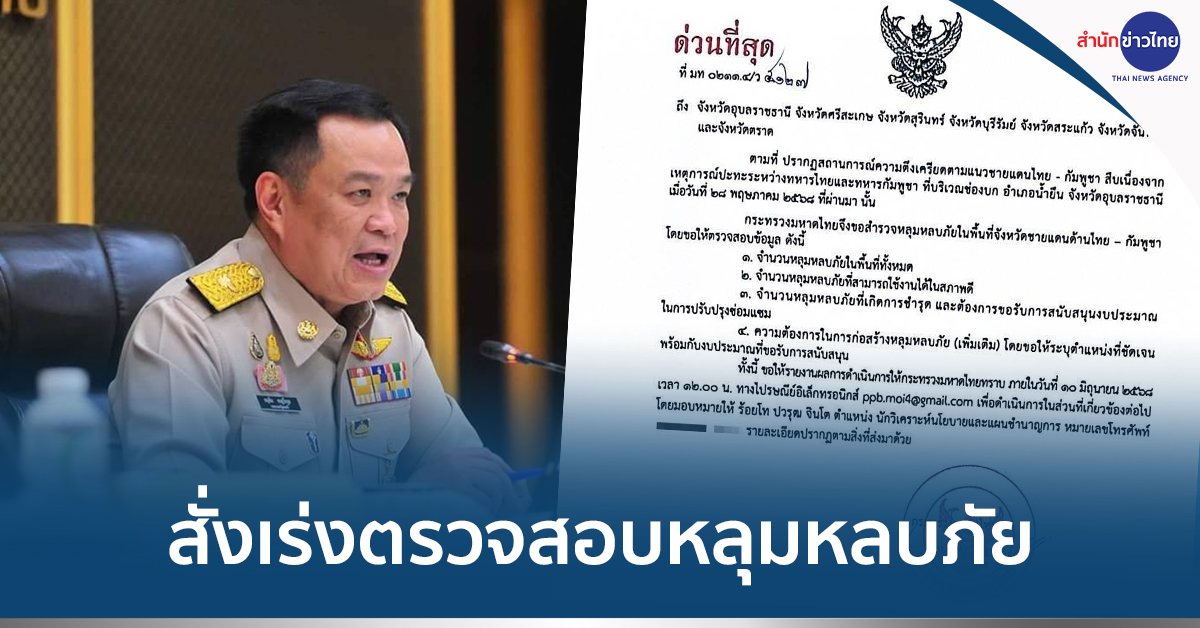 ล่าสุด ได้มีข้อสั่งการให้นายอรรษิษฐ์ สัมพันธรัตน์ ปลัดกระทรวงมหาดไทย ประสานผู้ว่าราชการจังหวัดอุบลราชธานี ศรีสะเกษ สุรินทร์ บุรีรัมย์ สระแก้ว จันทบุรี และจังหวัดตราด เร่งดำเนินการตรวจสอบจำนวนหลุมหลบภัยในพื้นที่ทั้งหมด โดยสำรวจว่ามีหลุมหลบภัยที่สามารถใช้งานได้ในสภาพดีจำนวนกี่แห่ง จำนวนหลุมหลบภัยที่ชำรุดและต้องการขอรับการสนับสนุนงบประมาณในการปรับปรุงซ่อมแซมกี่แห่ง รวมทั้งสำรวจความต้องการในการก่อสร้างหลุมหลบภัยในพื้นที่เพิ่มเติม พร้อมระบุสถานที่และประมาณการงบประมาณที่ต้องการขอรับการสนับสนุน รายงานมายังกระทรวงมหาดไทย ภายในวันที่ 10 มิ.ย. 2568 ทั้งนี้ เพื่อดูแลความปลอดภัยของประชาชน รวมทั้งเตรียมความพร้อมให้ทันต่อสถานการณ์ที่อาจจะเกิดขึ้นต่อไป .319.-สำนักข่าวไทย