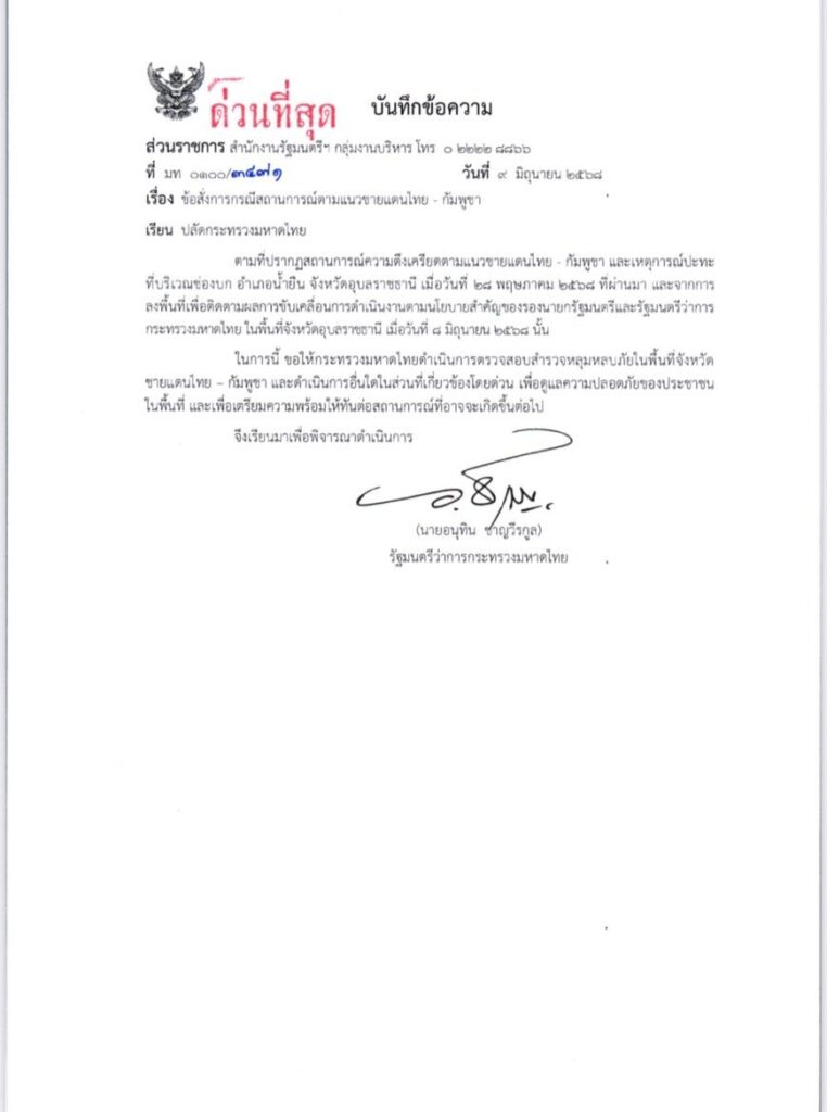 กทม. 9 มิ.ย. – “อนุทิน” สั่งการผู้ว่าฯ 7 จังหวัดแนวชายแดนไทย-กัมพูชา เร่งตรวจสอบจำนวนหลุมหลบภัยในพื้นที่ เพื่อเตรียมพร้อมดูแลความปลอดภัยประชาชน