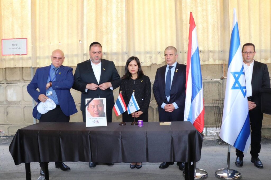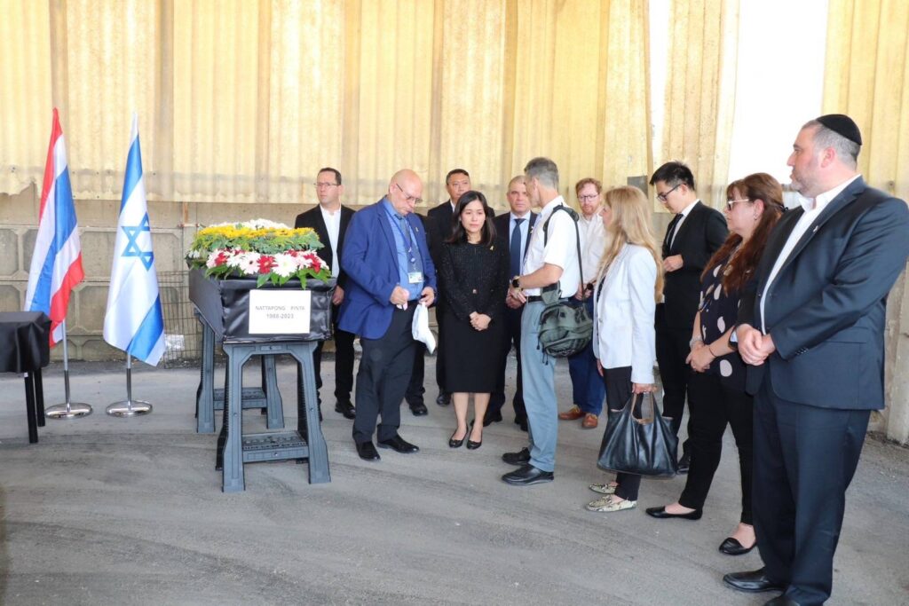 วันนี้ (10 มิถุนายน 2568) เวลา 15.30 น. นางสาววรพร กาญจนะวงศ์ อุปทูตฯ พร้อมด้วยนายกิตติ์ธนา ศรีสุริยะ อัครราชทูตที่ปรึกษา (ฝ่ายแรงงาน) เจ้าหน้าที่สถานเอกอัครราชทูตฯ และฝ่ายแรงงาน ได้เป็นผู้แทนฝ่ายไทยเข้าร่วมพิธีไว้อาลัยและส่งร่างนายณัฐพงษ์ ปินตา ตัวประกันชาวไทยที่เสียชีวิตในกาซา กลับประเทศไทย ณ ท่าอากาศยานนานาชาติ Ben Gurion กรุงเทลอาวีฟ ผู้แทนฝ่ายอิสราเอลประกอบด้วยนาย Moshe Arbel รัฐมนตรีว่าการกระทรวงมหาดไทย พลจัตวา Gal Hirsch ผู้ประสานงานด้านตัวประกันและบุคคลสูญหาย นาย Eliyahu Yifrach รองปลัดกระทรวงการต่างประเทศด้านกิจการกงสุล นาย Sagi Karni อธิบดีกรมเอเชียแปซิฟิก กระทรวงการต่างประเทศ และนาย Moshe Nakash อธิบดีด้านการบริหารจัดการแรงงานต่างชาติ สำนักงานประชากรและตรวจคนเข้าเมือง พร้อมด้วยเจ้าหน้าที่หน่วยงานที่เกี่ยวข้องต่าง ๆ โดยทั้งสองฝ่ายได้ทำการเคารพศพ วางพวงหรีดไว้อาลัย และกล่าวแสดงความเสียใจอย่างยิ่งต่อการเสียชีวิตของนายณัฐพงษ์
