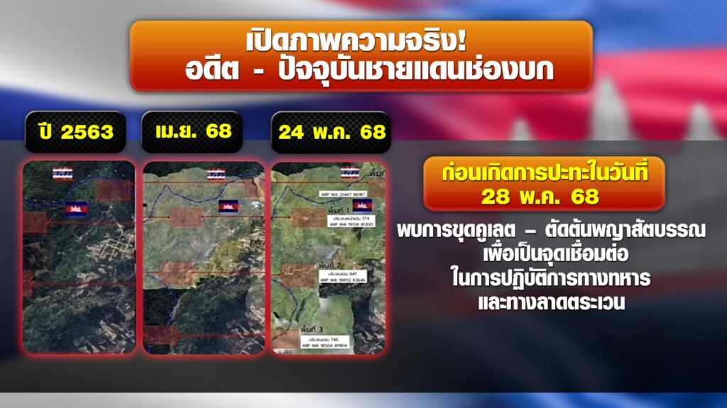 11 มิ.ย. – ‘กองทัพไทย’ เปิดภาพถ่ายแผนที่ทางอากาศ ชายแดนช่องบก อุบลราชธานี เปรียบเทียบอดีต-ปัจจุบัน พบการทำกิจกรรมทางทหาร-ขุดคูเลต-ทำถนนส่งกำลังบำรุง ก่อนเหตุปะทะช่องบก 28 พ.ค.2568