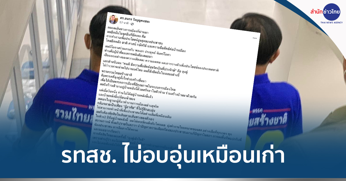 พรรครวมไทยสร้างชาติคือพรรคที่ลุงตู่ตั้งใจช่วยสร้างขึ้นมาเพื่อให้เป็นพรรคการเมืองที่มีคุณภาพในระบบการเมืองไทย ผมจึงก้าวเข้ามาอยู่บ้านหลังนี้ด้วยศรัทธาในตัวท่าน ร่วมสร้างบ้านมาด้วยกัน แต่เมื่อวันหนึ่ง ท่านไม่ได้อยู่บ้านหลังนี้แล้ว และบ้านหลังนี้เปลี่ยนเจ้าของ ผมเองในฐานะผู้ที่มาทำงานการเมืองอย่างสุจริต กลับกลายเป็นเพียง “ผู้อาศัย” ที่ไม่รู้สึกอบอุ่น ไม่สามารถทำหน้าที่เพื่อประชาชนได้อย่างเต็มที่เหมือนเดิม ผมจึงต้องตัดสินใจเดินตามเส้นทางของตัวเอง ในช่วง 2 ปีที่อยู่บ้านหลังนี้ ผมไม่เคยขัดแย้งกับใครเลย มุ่งทำงานในบทบาทของ สส.อย่างเต็มที่ทุกเวลา ทุกสถานการณ์ ทั้งอภิปรายในสภาฯ นำปัญหาความเดือดร้อนของประชาชนมาแก้ปัญหาในสภา การลงพื้นที่พบปะกับพี่น้องประชาชน การสื่อสารให้พรรค และผมอยากเรียนว่าการตัดสินใจของผมครั้งนี้ “ลุงตู่เข้าใจดี” เพราะท่านรู้ว่า ผมไม่เคยเปลี่ยนหัวใจในการทำงานการเมืองเพื่อพี่น้องประชาชนและไม่เคยหันหลังให้กับอุดมการณ์ที่ท่านยึดถือมา