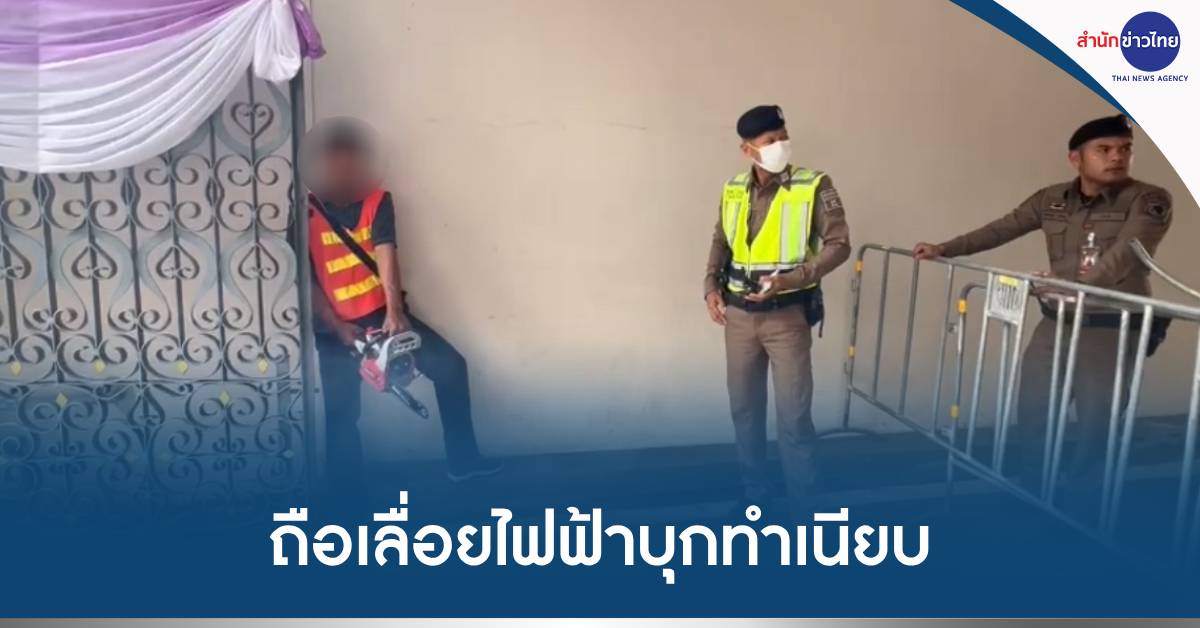 ได้มีผู้ชายคนหนึ่งแต่งกายด้วยเสื้อกั๊กสะท้อนแสงสีส้ม กางเกงยีนส์ขายาว ในมือทั้งสองข้างถือเลื่อยไฟฟ้าที่ติดเครื่องไว้ตลอด โดยบุกเข้ามาและพยายามจะเข้าไปบริเวณภายในทำเนียบ สร้างความแตกตื่นทั้งเจ้าหน้าที่ตำรวจ ข้าราชการ และ บุคคลที่เข้ามาปฎิบัติหน้าที่ ในทำเนียบรัฐบาล ที่กำลังเดินอยู่ในบริเวณดังกล่าว