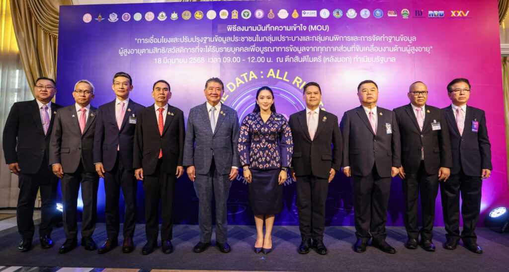 น.ส.แพทองธาร ชินวัตร นายกรัฐมนตรี เป็นประธานและสักขีพยานในพิธีลงนามบันทึกความเข้าใจ “การเชื่อมโยงและปรับปรุงฐานข้อมูลประชาชนในกลุ่มเปราะบางและกลุ่มคนพิการ และการจัดทำฐานข้อมูลผู้สูงอายุตามสิทธิ สวัสดิการ ที่จะได้รับรายบุคคล เพื่อบูรณาการข้อมูลจากทุกภาคส่วนที่ขับเคลื่อนงานด้านผู้สูงอายุ” ระหว่าง 29 ฝ่าย ได้แก่ 15 กระทรวง 14 หน่วยงาน โดยมี นายวราวุธ ศิลปอาชา รมว.การพัฒนาสังคมและความมั่นคงของมนุษย์ นพ.พรหมินทร์ เลิศสุริย์เดช เลขาธิการนายกรัฐมนตรี นายภูมิธรรม เวชยชัย รองนายกรัฐมนตรี และรมว.กลาโหม นายเดชอิศม์ ขาวทอง รมช.สาธารณสุข และนายอนุกูล ปีดแก้ว ปลัดกระทรวงการพัฒนาสังคมและความมั่นคงของมนุษย์ ร่วมเป็นสักขีพยาน