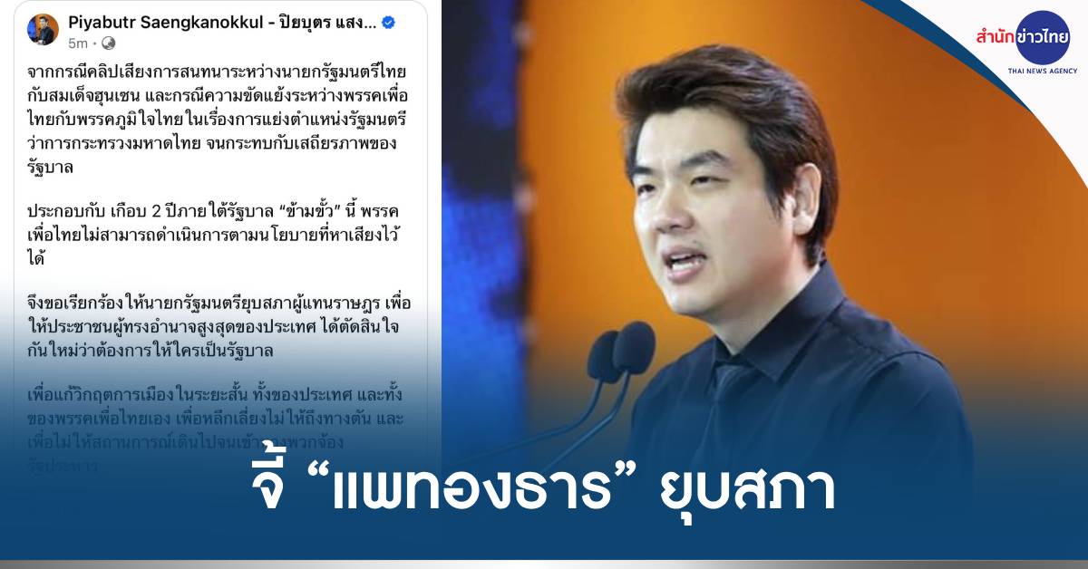กทม. 18 มิ.ย.-ยุบสภาเถอะ! “ปิยบุตร” จี้ “แพทองธาร” แสดงภาวะผู้นำ ยุบสภา เซ่นคลิปเสียงคุย “ฮุน เซน” หลีกเลี่ยงทางตันไม่ให้เกิดรัฐประหาร