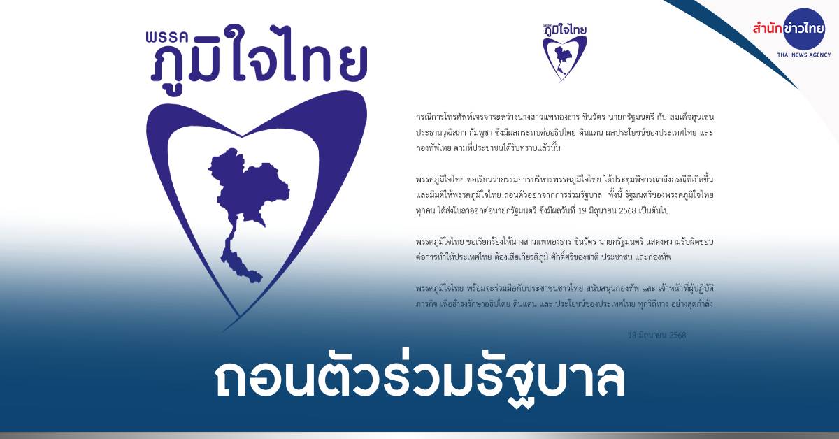 พรรคภูมิใจไทย ขอเรียนว่า กรรมการบริหารพรรคภูมิใจไทย ได้ประชุมพิจารณาถึงกรณีที่เกิดขึ้น และมีมติให้พรรคภูมิใจไทย ถอนตัวออกจากการร่วมรัฐบาล ทั้งนี้ รัฐมนตรีของพรรคภูมิใจไทยทุกคน ได้ส่งใบลาออกต่อนายกรัฐมนตรี ซึ่งมีผลวันที่ 19 มิถุนายน 2568 เป็นต้นไป