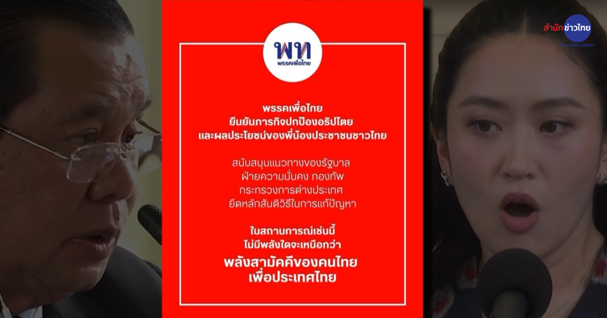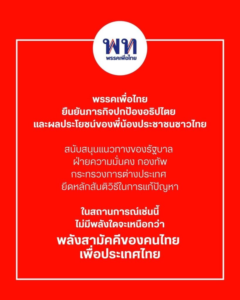 ผู้สื่อข่าวรายงานว่า เมื่อเวลา 22.55 น. (18 มิ.ย.) พรรคเพื่อไทยได้โพสต์ข้อความผ่านโซเชียลมีเดียว่า พรรคเพื่อไทยยืนยันภารกิจปกป้องอธิปไตย และผลประโยชน์ของพี่น้องประชาชนชาวไทย สนับสนุนแนวทางของรัฐบาล ฝ่ายความมั่นคง กองทัพ กระทรวงการต่างประเทศ ยึดหลักสันติวิธีในการแก้ปัญหา ในสถานการณ์เช่นนี้ ไม่มีพลังใดจะเหนือกว่าพลังสามัคคีของคนไทย เพื่อประเทศไทย.-สำนักข่าวไทย