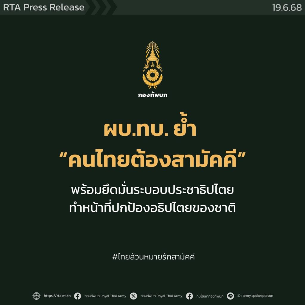 กองทัพบก 19 มิ.ย. – ผบ.ทบ. แสดงจุดยืนยึดมั่นระบอบประชาธิปไตย พร้อมทำหน้าที่ปกป้องอธิปไตยของชาติ ย้ำสถานการณ์บ้านเมืองในเวลานี้ “คนไทยต้องสามัคคี”