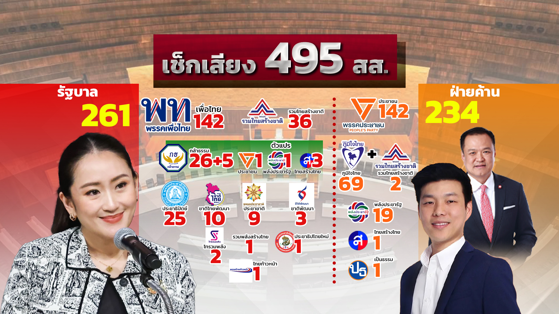 กรุงเทพฯ 19 มิ.ย. – ตรวจสอบเสียง สส. ทั้งฝ่ายรัฐบาลและฝ่ายค้าน ขณะนี้เป็นอย่างไร และฉากทัศน์ทางการเมือง หลังปมคลิปเสียงของรัฐบาล “แพทองธาร ชินวัตร” – สำนักข่าวไทย