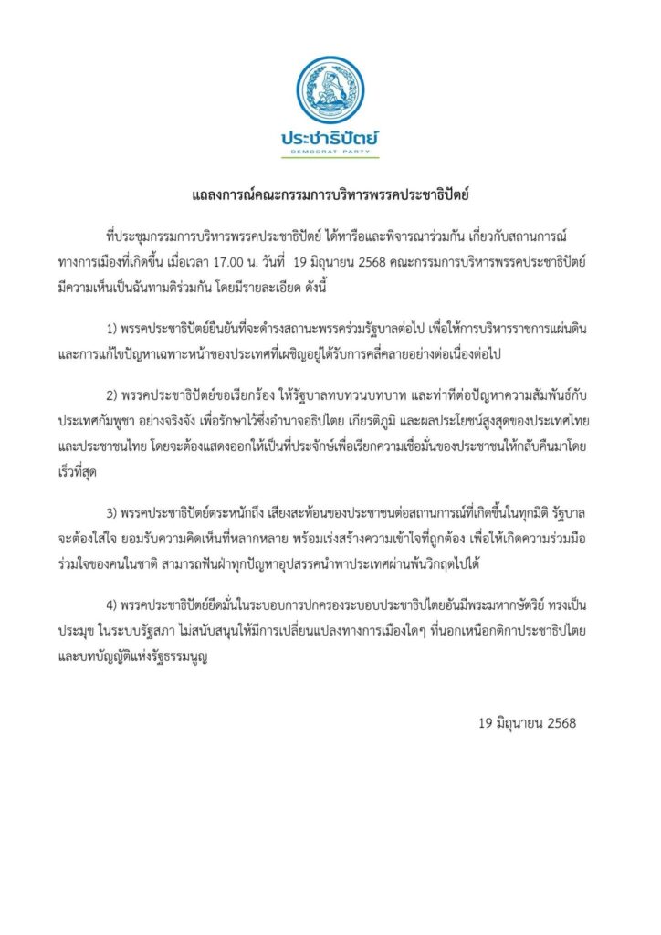 พรรคประชาธิปัตย์ออกแถลงการณ์ระบุว่า ที่ประชุมกรรมการบริหารพรรคประชาธิปัตย์ ได้หารือและพิจารณาร่วมกัน เกี่ยวกับสถานการณ์ทางการเมืองที่เกิดขึ้น เมื่อเวลา 17.00 น. วันที่ 19 มิถุนายน 2568