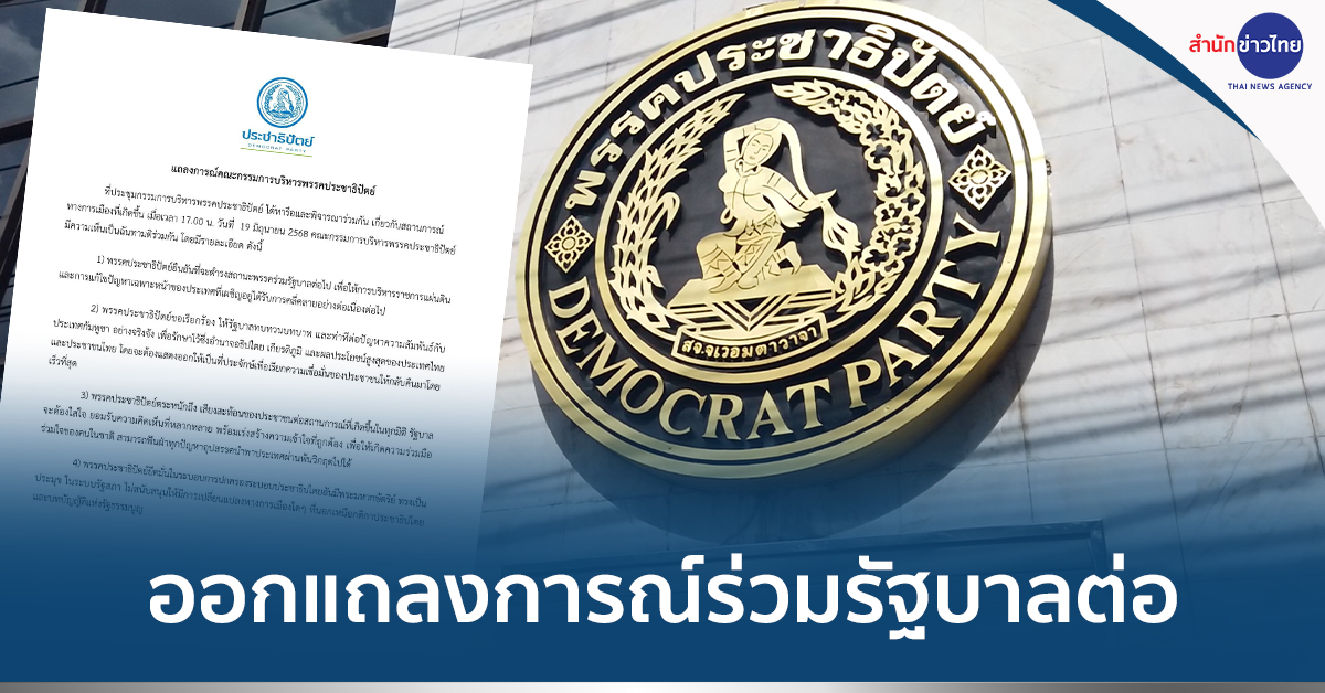 พรรคประชาธิปัตย์ 20 มิ.ย.- “ประชาธิปัตย์” ออกแถลงการณ์ยืนยันดำรงสถานะพรรคร่วมรัฐบาล พร้อมขอให้ทบทวนท่าทีความสัมพันธ์กับกัมพูชา